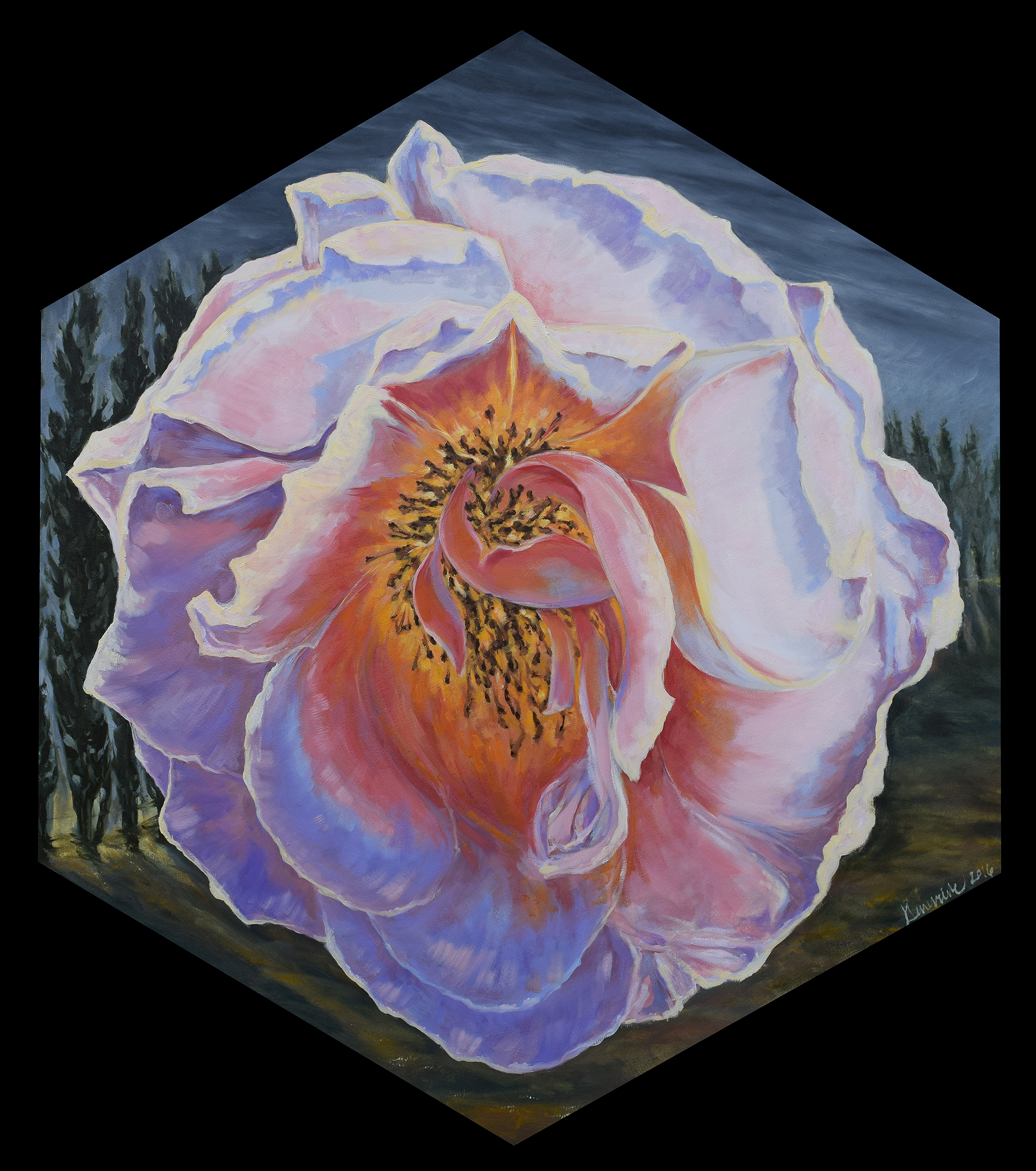 “Grief, gratitude” Oil on hexagonal canvas, 38 x 33 inches 2016