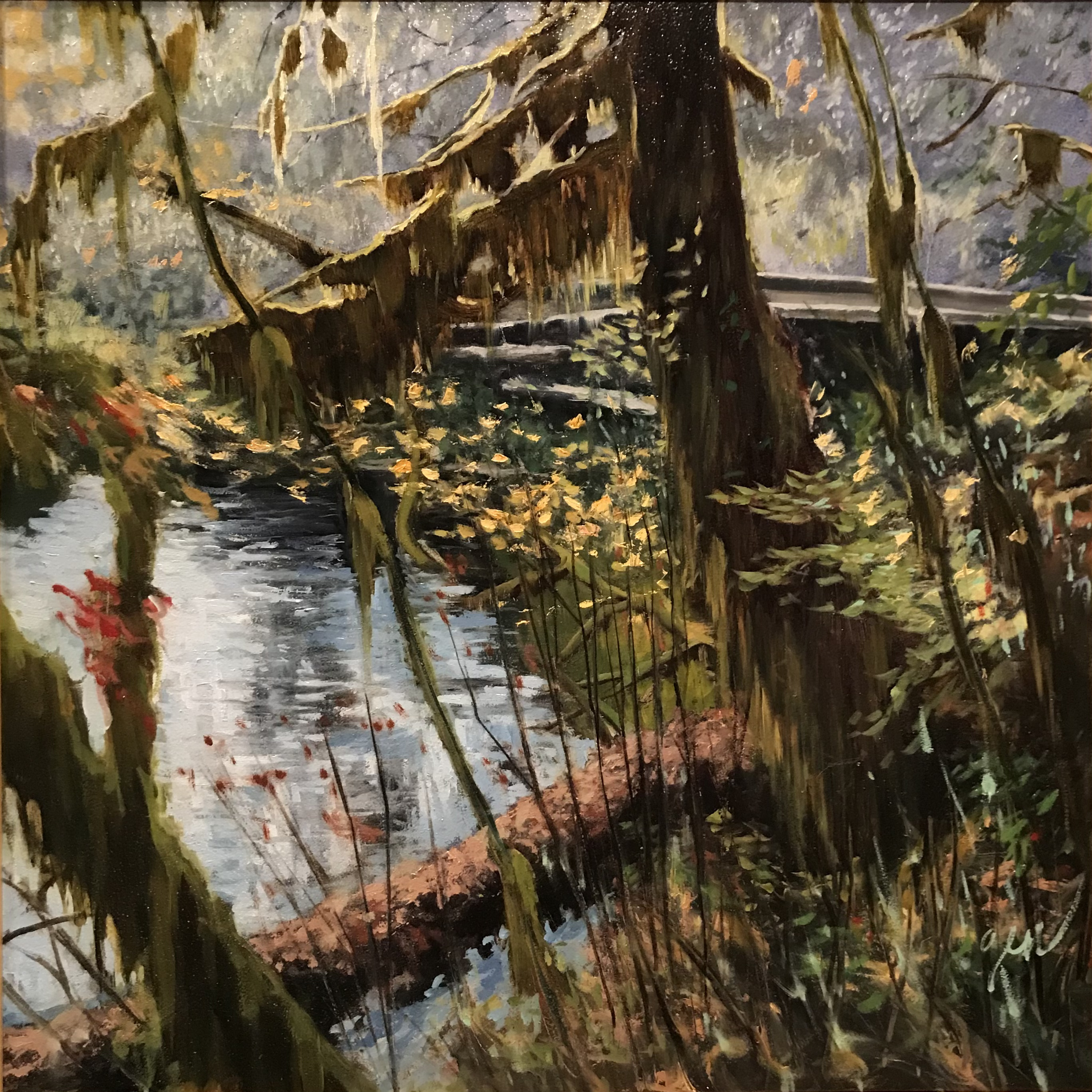 Oil on board 24โx24โ Hoh Rainforest, Olympic National Forest, Washington Sold ๐ด
